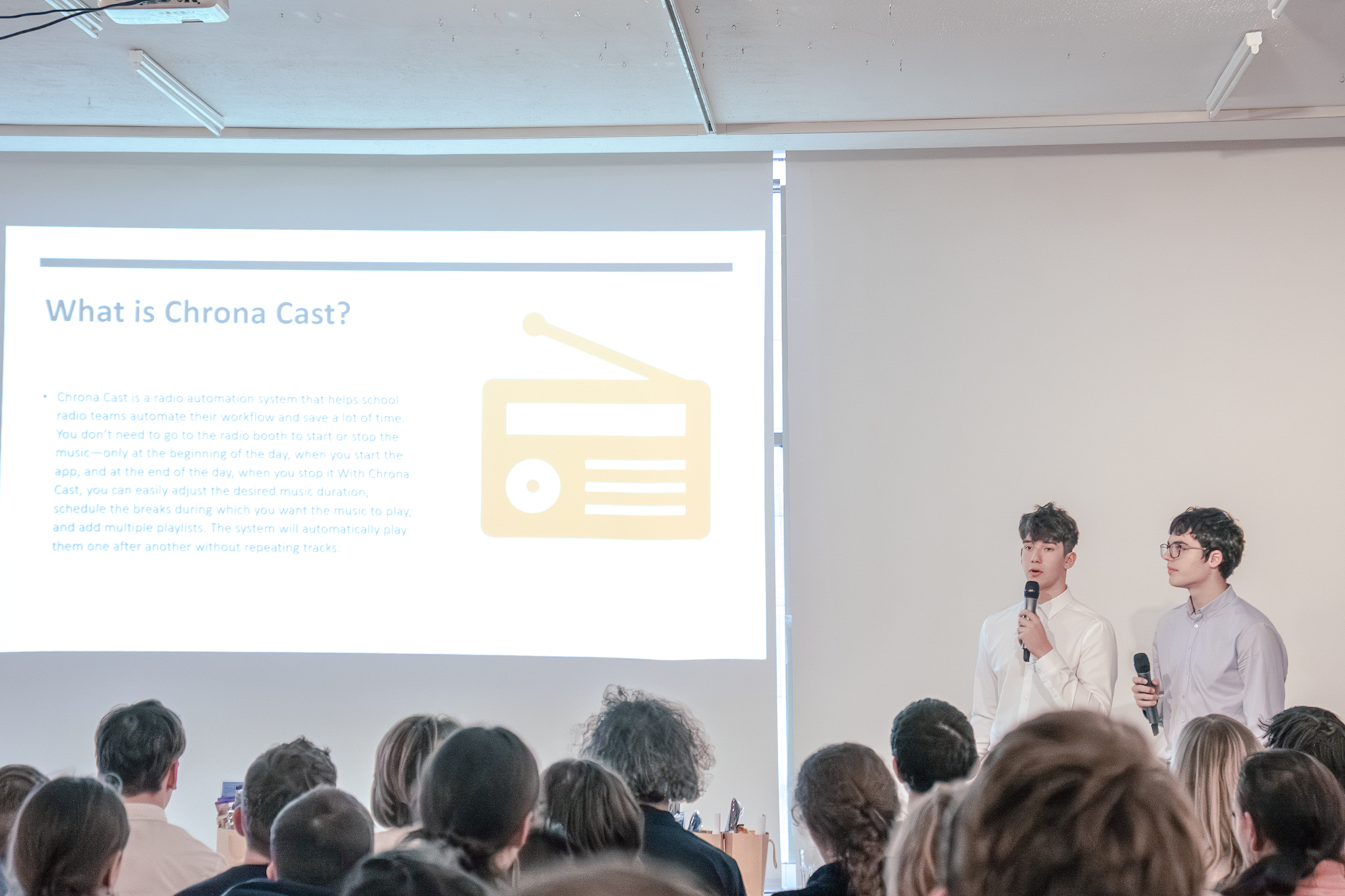 După ce au consultat și alte echipe de radio din licee din țară, David și Erick au realizat că problema este generală. Astfel, au creat o aplicație simplificată care permite programarea muzicii să pornească și să se oprească automat, exact pe durata pauzelor, eliberând elevii de sarcini repetitive.